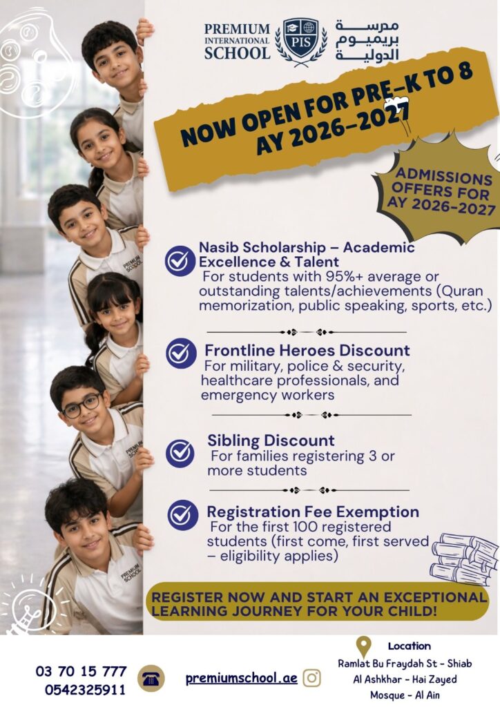 At Premium International School, we believe that every child has the potential to shine. As a school of distinction in Al Ain, we proudly blend globally recognized academic excellence with deep-rooted respect for the national identity of the United Arab Emirates. Our vision is to create a vibrant learning community where every student is known, valued, and nurtured—academically, personally, and socially.